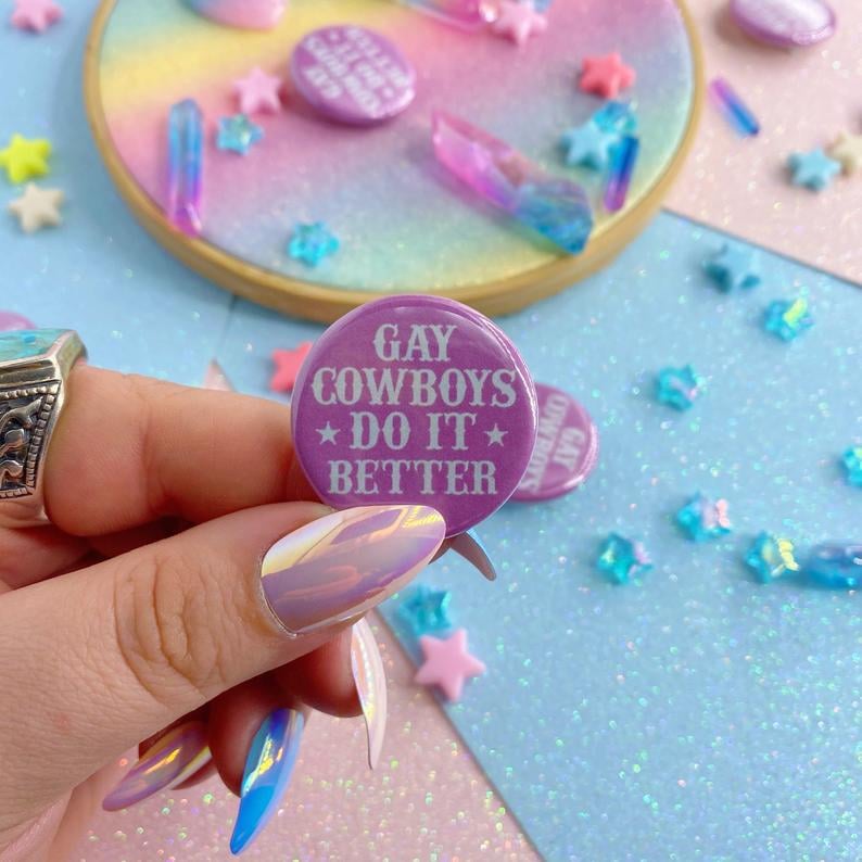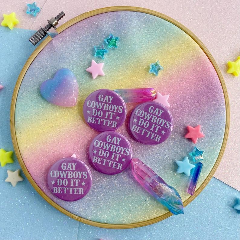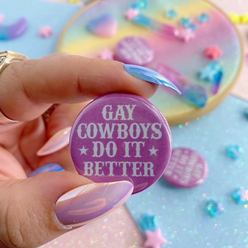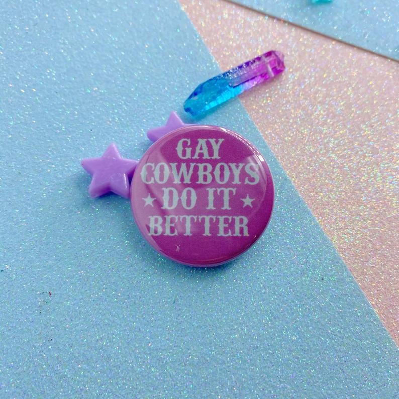 This button badge features the message "Gay Cowboys Do It Better". It measures 32mm, and is made to last. Really show off your true colours with this button; attach it to jackets, bags, tees, hats, or anywhere else you can think of.