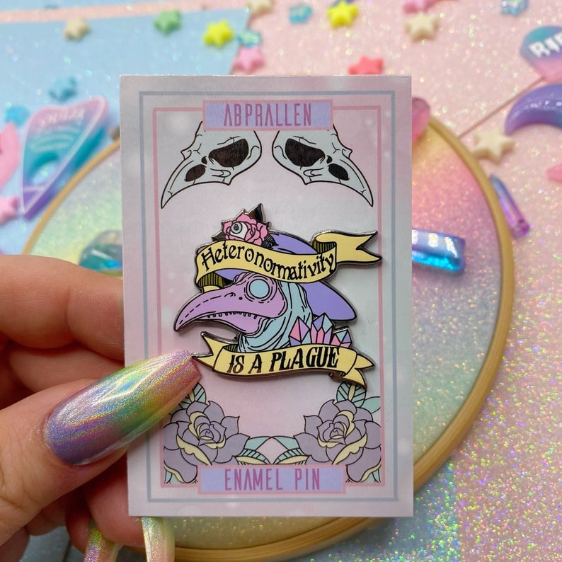 Celebrate resistance and trans pride with this pastel enamel pin, featuring a plague doctor in a bold trad tattoo-inspired design. The gender binary, compulsive heterosexuality, gender roles, and the patriarchy are an outdated concept that worms its way into daily life. Queer people are the perfect example of why heteronormativity doesn't work and our lives are the antidote to this plague! Perfect for collectors, beautifully weird goths, and most importantly - queer and trans people who live unapologetically!