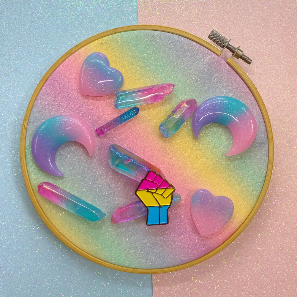 This Pan Pride pin is for all pansexual people, whether you just realised you're pan or you've known for years. Your identity is real, valid, and Yours.