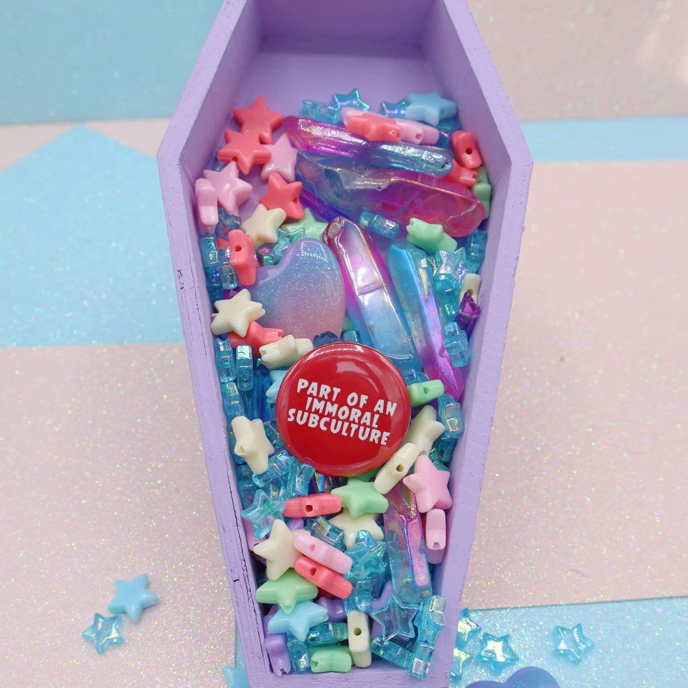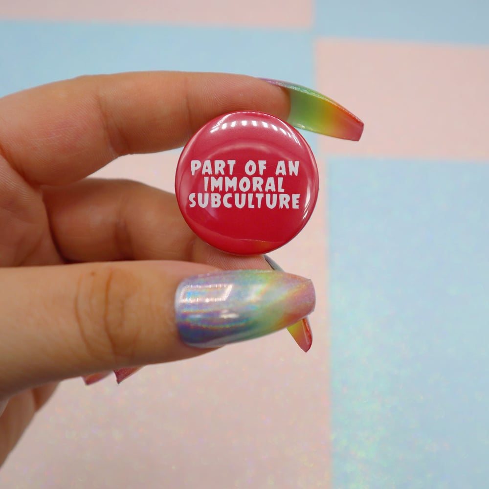 This button badge features the message "Part Of An Immoral Subculture". It measures 32mm, and is made to last. Really show off your true colours with this button; attach it to jackets, bags, tees, hats, or anywhere else you can think of.